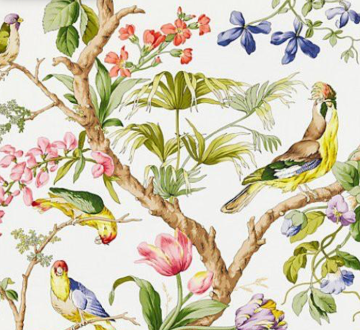 Scalamandre’s Belize pattern is filled with vibrant colors and all sorts of tropical birds. I love colorful birds.